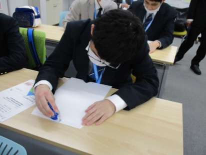 また、全員で封入作業の体験を行いました。社長さんからは、働く上で「生活リズムを整えること」「人の話を素直に聞くこと」「マニュアルを読んだり計算をするために、学校で勉強することが必要であること」など、説得力のあるお話をいただきました。中3学年の生徒は進学に向けた準備を進めている真っ只中です。今回の見学が、自分自身の少し先の未来を考えるきっかけになってくれると幸いです。