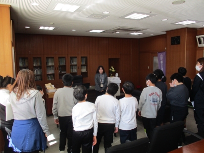 小学部5年生の進路見学がありました。みんなで考えた質問に答える形で、校長室の畝本校長先生、経営企画室の本田室長さん、高野栄養士さんから、お話をしていただきました。校長先生の大きな椅子に座って、決済のハンコ押しや電話の応答などの校長先生の仕事を体験したり、掃除などの主事さんの仕事を体験したりしました。