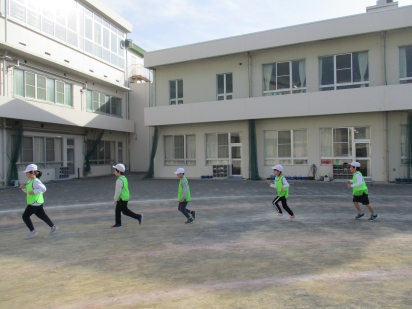 小学部2年生は、月曜日と木曜日の朝、グラウンドでランニングをしています。決められたコースを4周走りきることを全員で頑張っています。走り終わって、体操の位置に戻ってくると、お互いに拍手をしたり、ハイタッチをしたりしています。屈伸や伸脚などの準備運動も上手になりました。